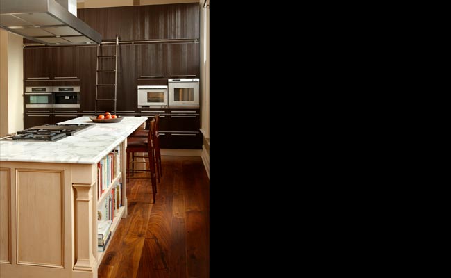 kitchen. A rolling library ladder in Walnut wood helps